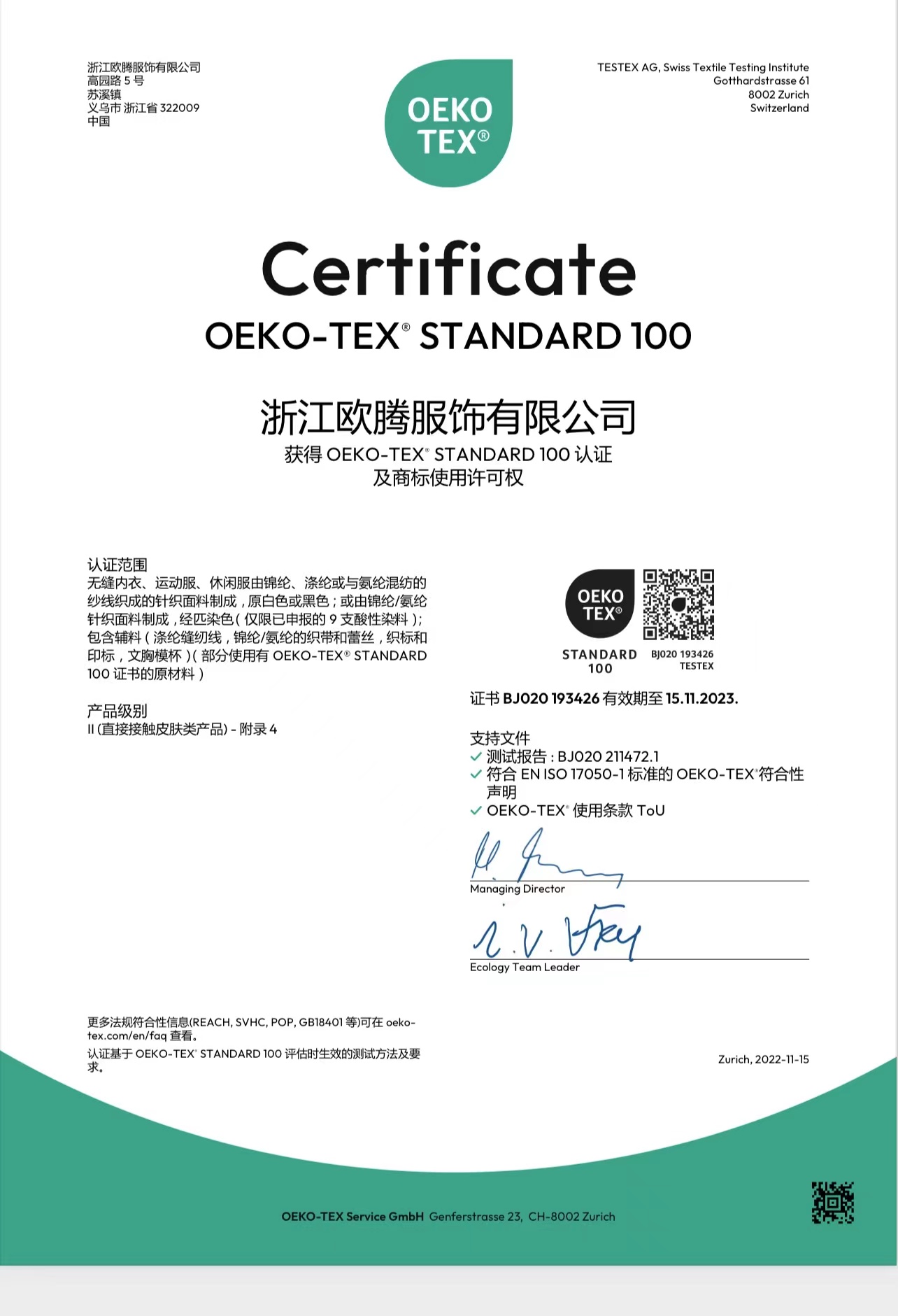 浙江歐騰服飾有限公司位于世界小商品之都-義烏。創(chuàng)立于2015年,是一家專業(yè)生產(chǎn)無縫針織運(yùn)動服飾和內(nèi)衣的工貿(mào)一體企業(yè),擁有自主出口權(quán)。 工廠的占地面積約16000平方米 ,引進(jìn)了大型圣東尼、高騰等多種先進(jìn)的制衣設(shè)備300余臺。月產(chǎn)能可達(dá)90萬件。 歐騰服飾每年投入近百萬資金打樣開發(fā)新產(chǎn)品,有著一支高素質(zhì)設(shè)計(jì)、技術(shù)員工隊(duì)伍。工廠先后通過了ISO 9001質(zhì)量管理體系認(rèn)證、BSCI認(rèn)證、GRS認(rèn)證、OEKO-TEX國際生態(tài)紡織品認(rèn)證等多項(xiàng)專利檢測報(bào)告。可提供OEM&ODM服務(wù)。歐騰服飾以一套完整、科學(xué)的質(zhì)量管理體系,生產(chǎn)的服裝從原材料紗線到成衣,質(zhì)量完全能夠滿足國內(nèi)、國際質(zhì)量要求。獲得了客戶一致好評。工廠先后獲得省科技型企業(yè)、國家高新企業(yè)、義烏市誠信講信用單位、規(guī)上企業(yè)、信用AAA級等榮譽(yù)。